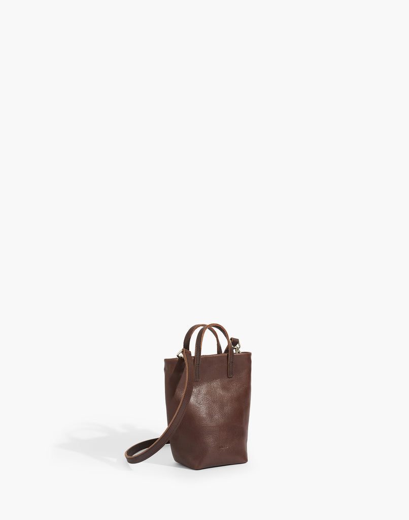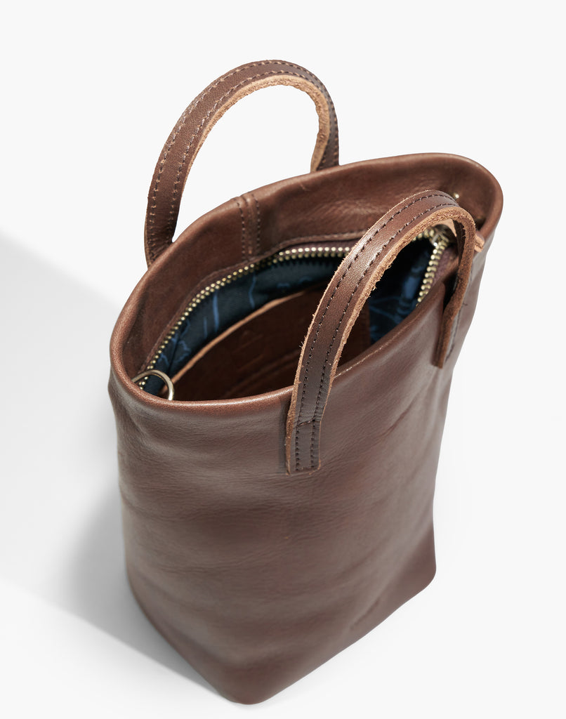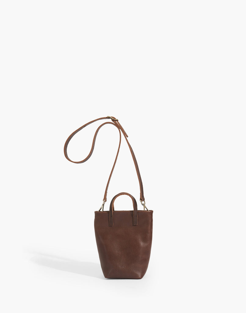 Crafted from smooth, vegetable-tanned natural leather, this extra-small handbag features a small debossed ‘NIMES’ logo, a top zippered closure, internal zippered pocket, printed cotton interior, and a removable leather strap — making it perfect for use as a crossbody bag