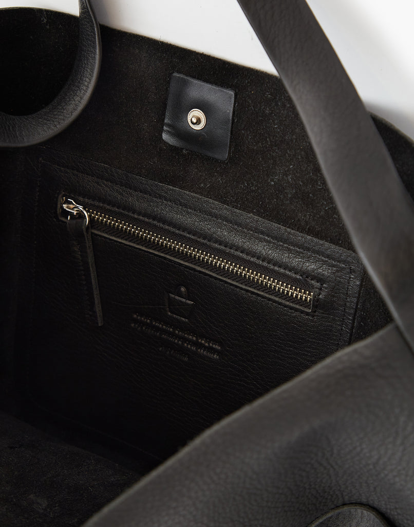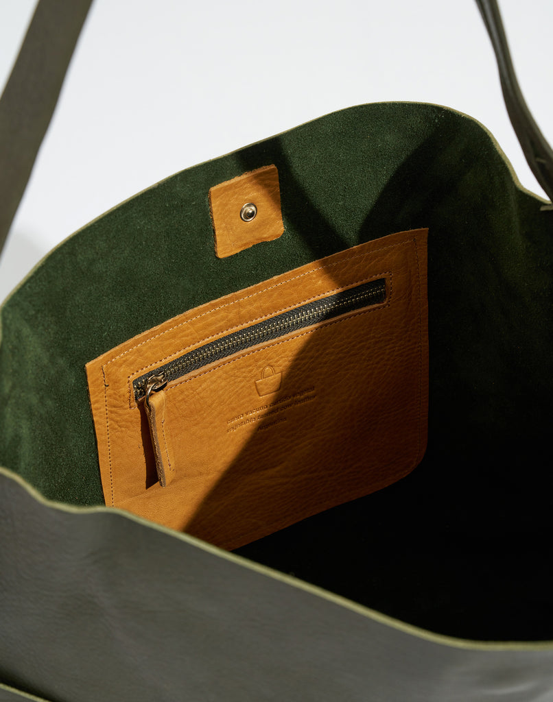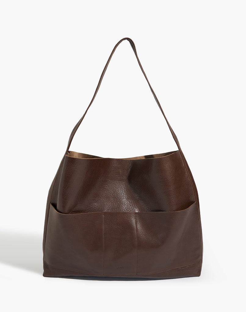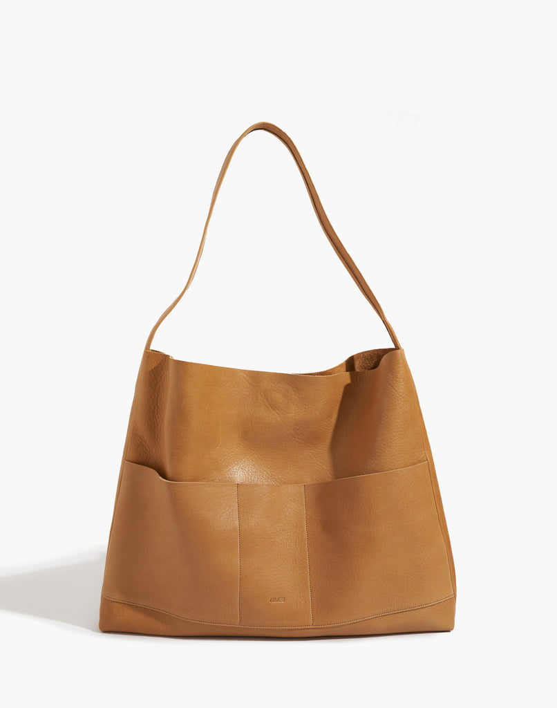 Crafted from grainy, vegetable-tanned natural leather, this bag features a small debossed ‘NIMES’ logo, three external front pockets, an internal zippered pocket, and an unlined interior.