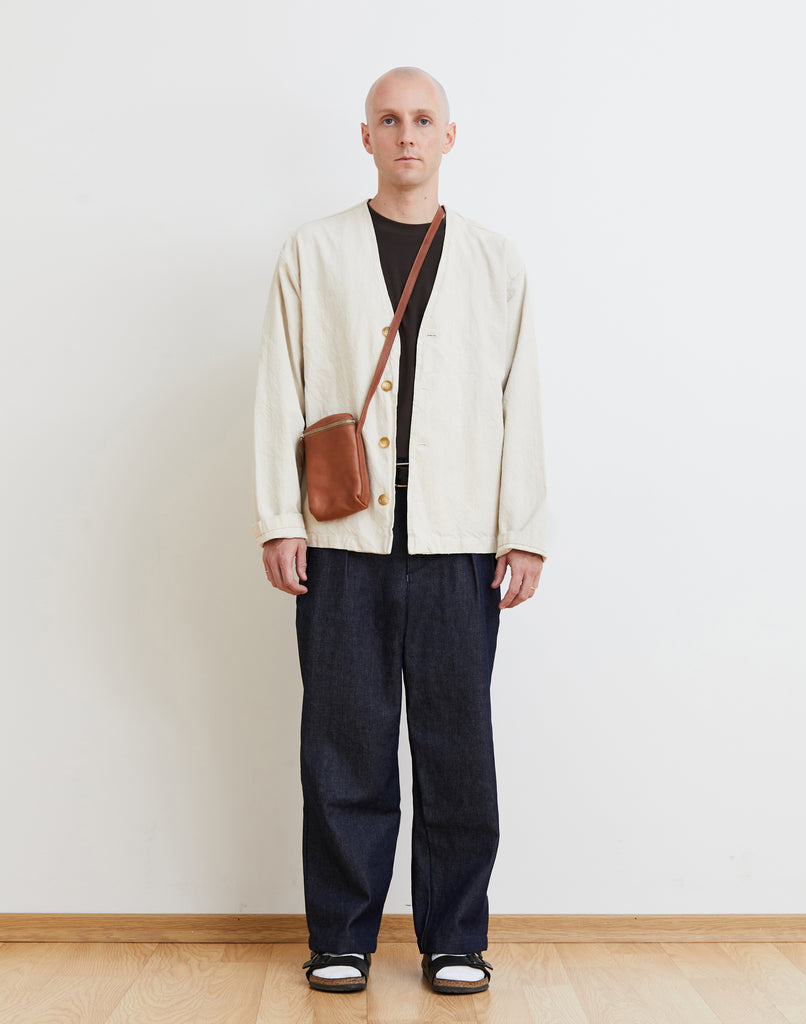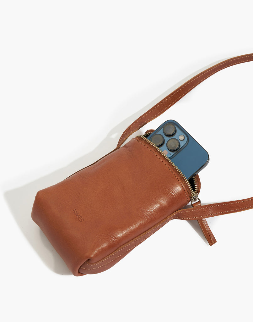 Crafted from smooth, vegetable-tanned natural leather, this mini crossbody bag features a small debossed ‘NIMES’ logo, a top zippered closure, a rear external pocket, an adjustable leather strap, and a printed cotton interior.