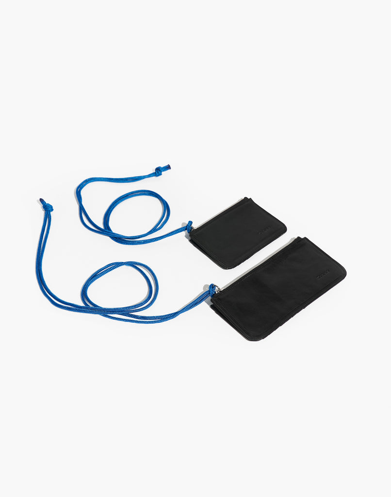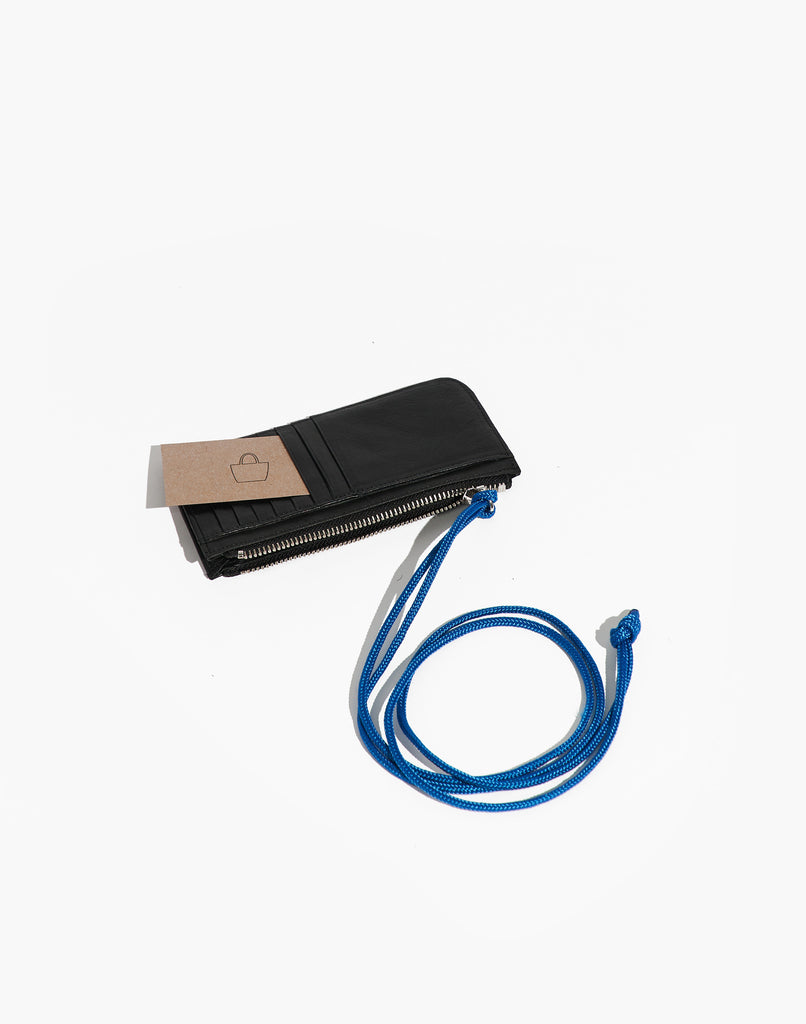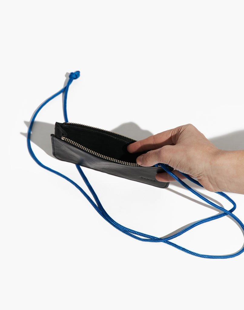 Vegetable tanned natural smooth leather wallet. Side zipper closure and four external credit card slots. Long blue cord attached to zipper for carrying. Leather lining.