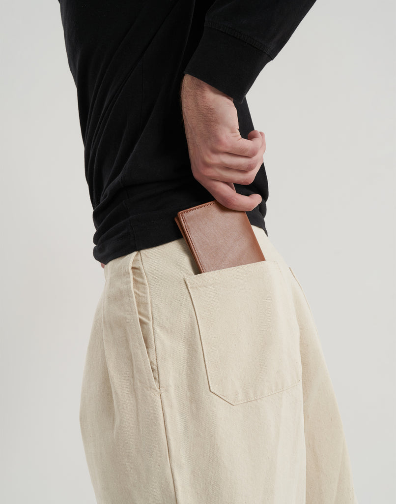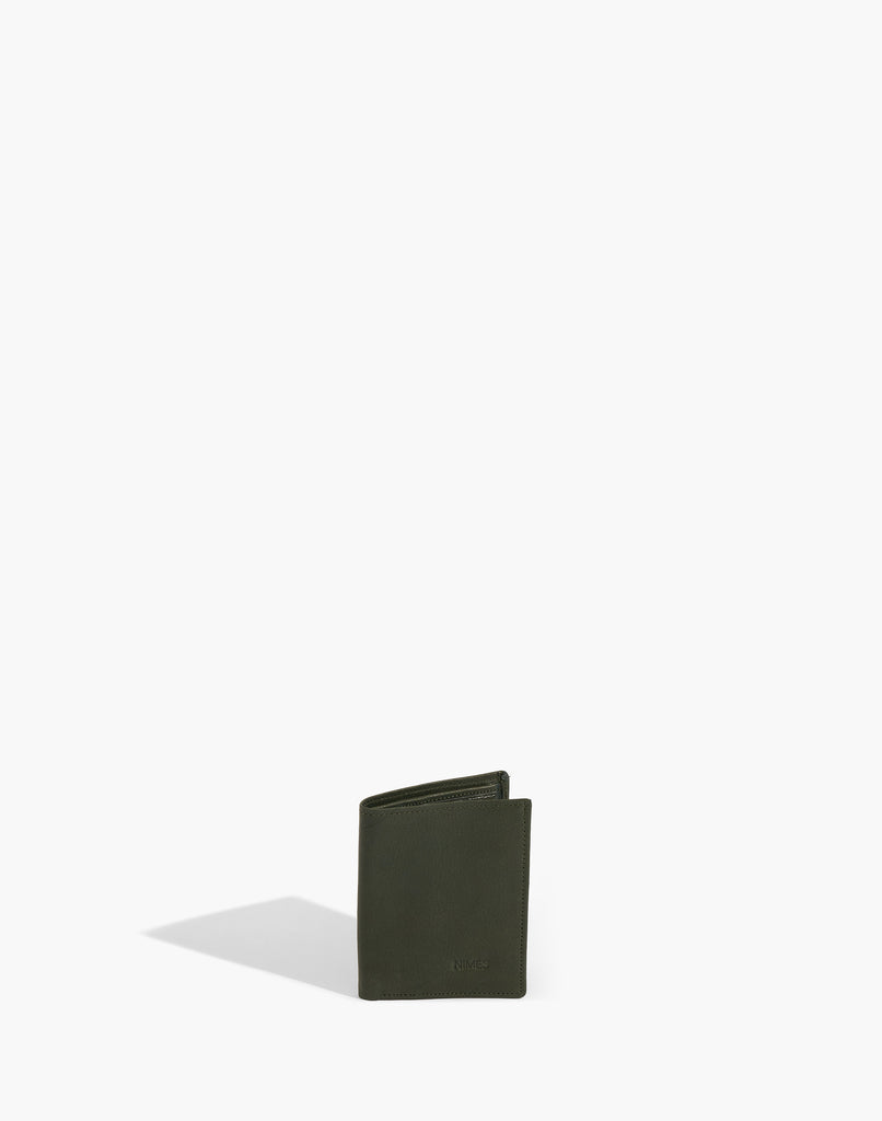 Crafted from grainy, vegetable-tanned natural leather, this wallet features a small debossed ‘NIMES’ logo, six internal card slots, and a bank note pocket sized for euros, with a printed cotton lining.