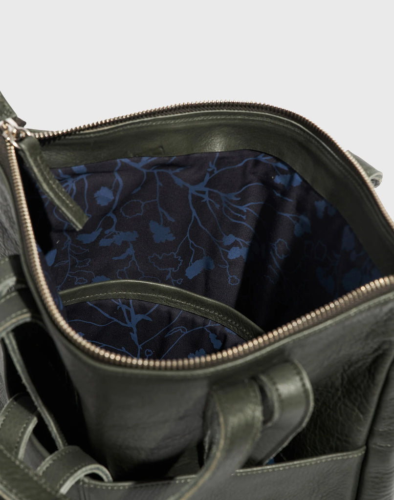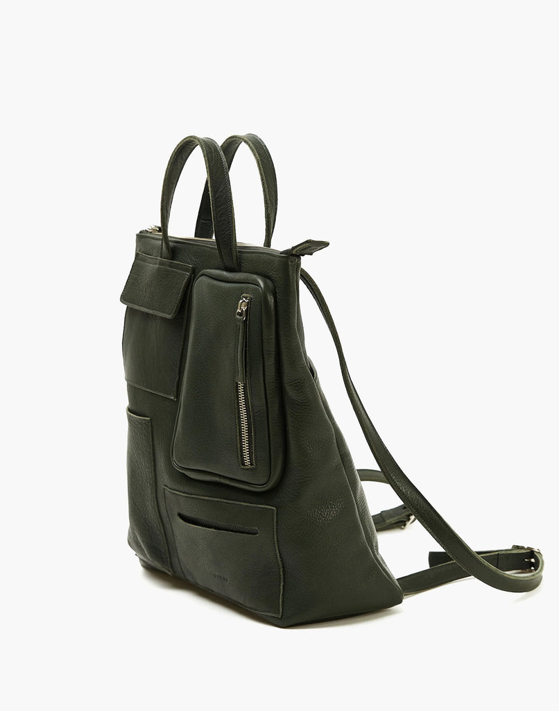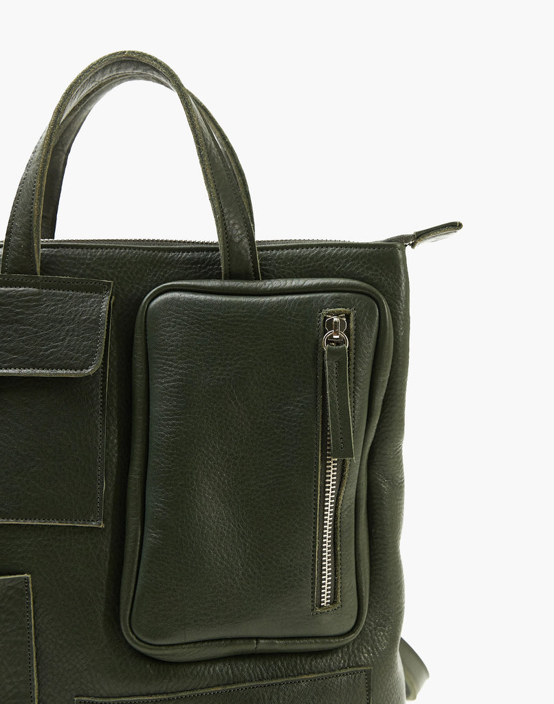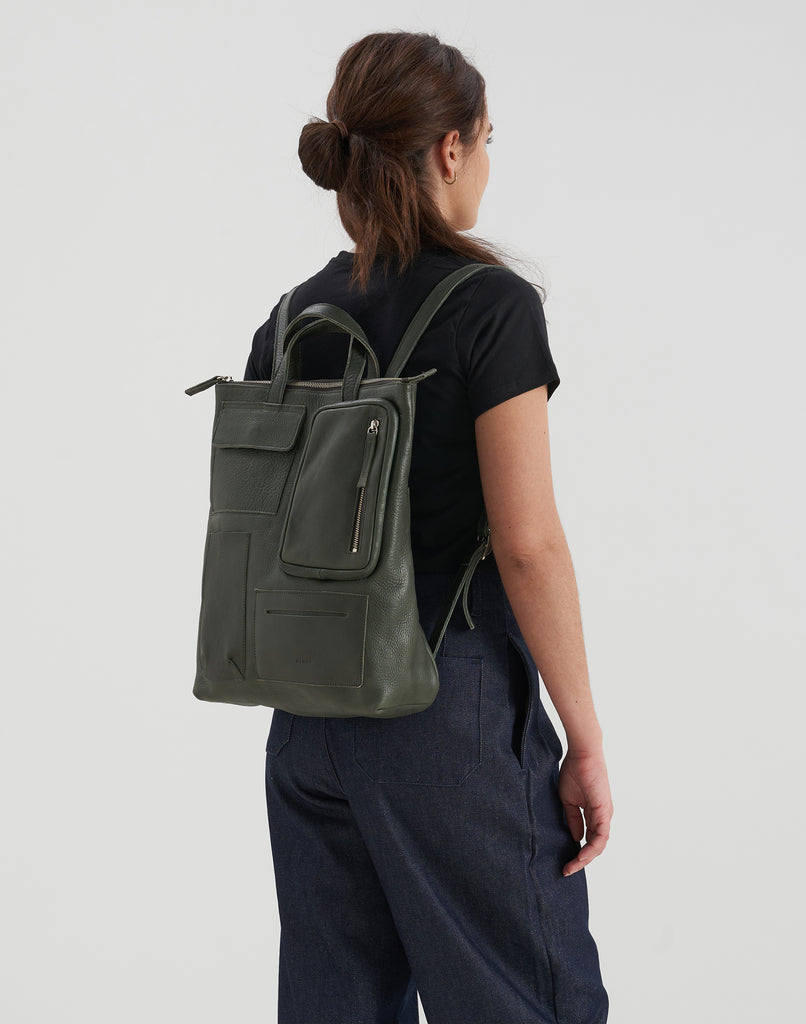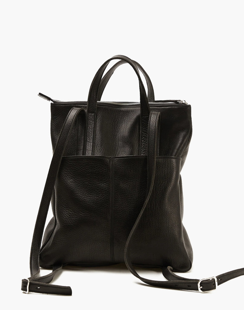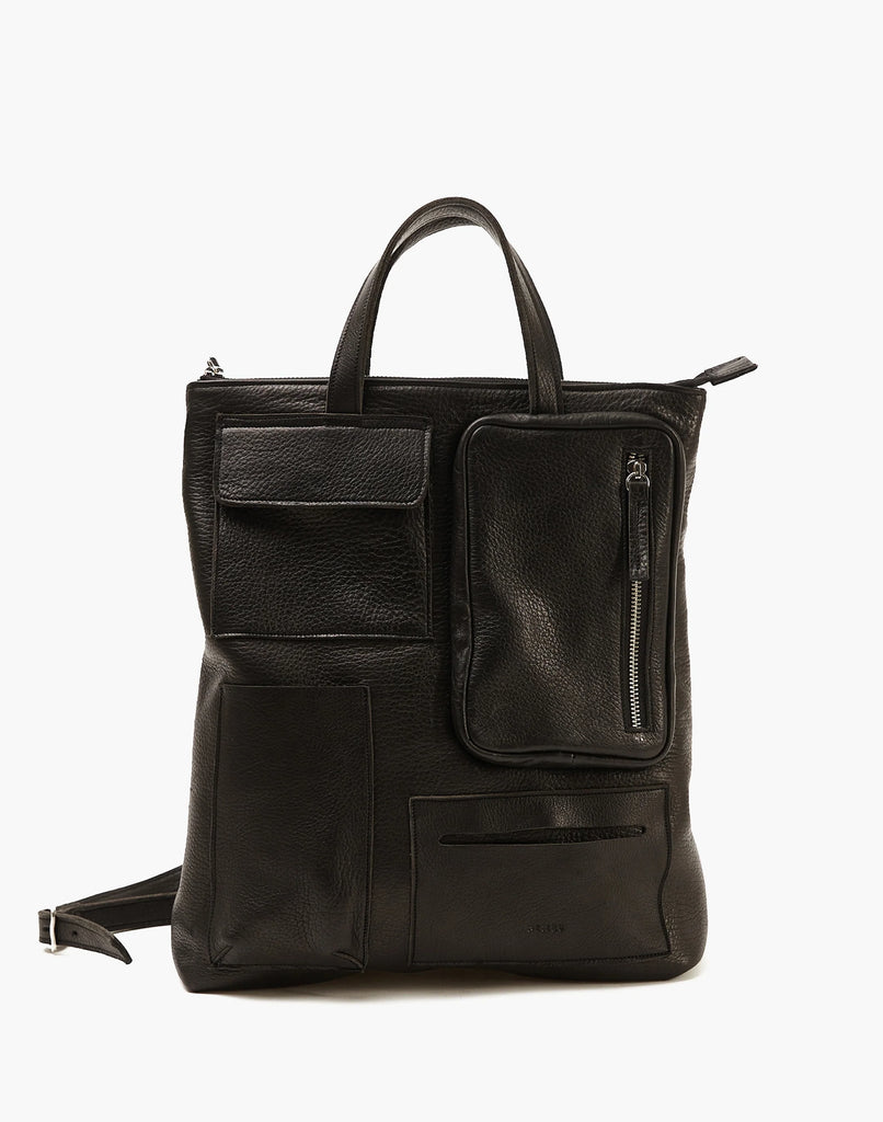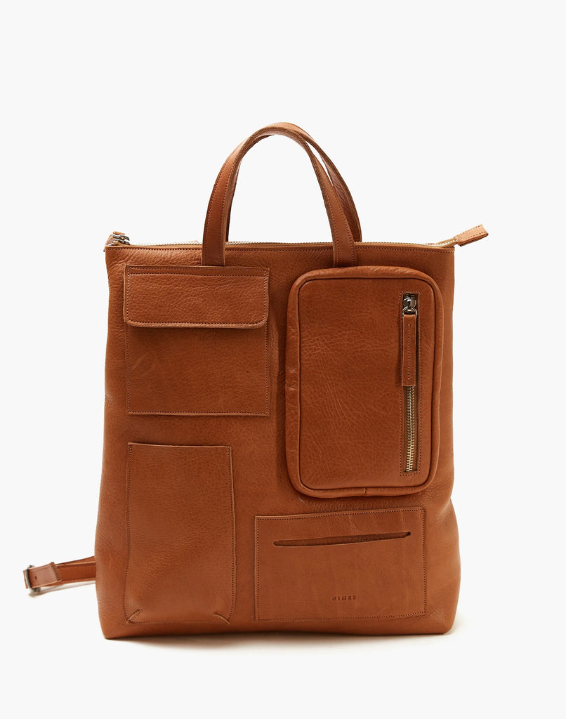 Crafted from grainy, vegetable-tanned natural leather, this backpack features four external front pockets (one zippered and one with a small debossed 'NIMES' logo), an external back pocket, adjustable shoulder straps, an interior division, and a printed cotton interior. It is designed to fit a laptop up to 14 inches.