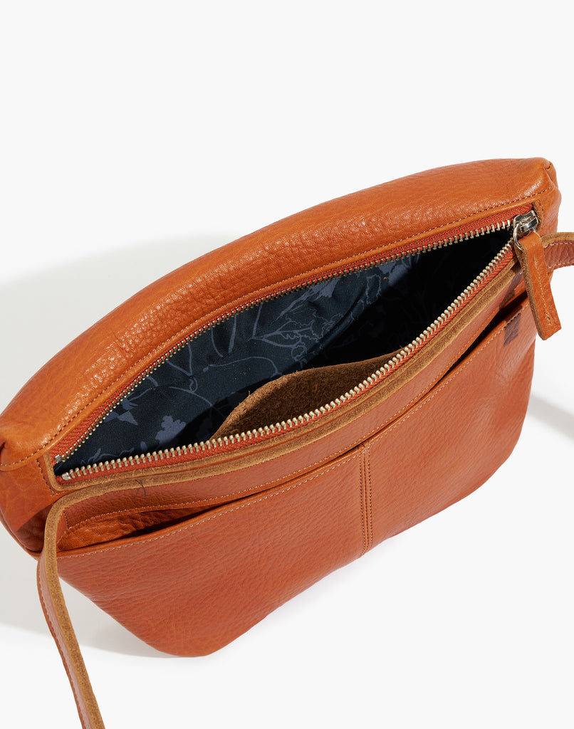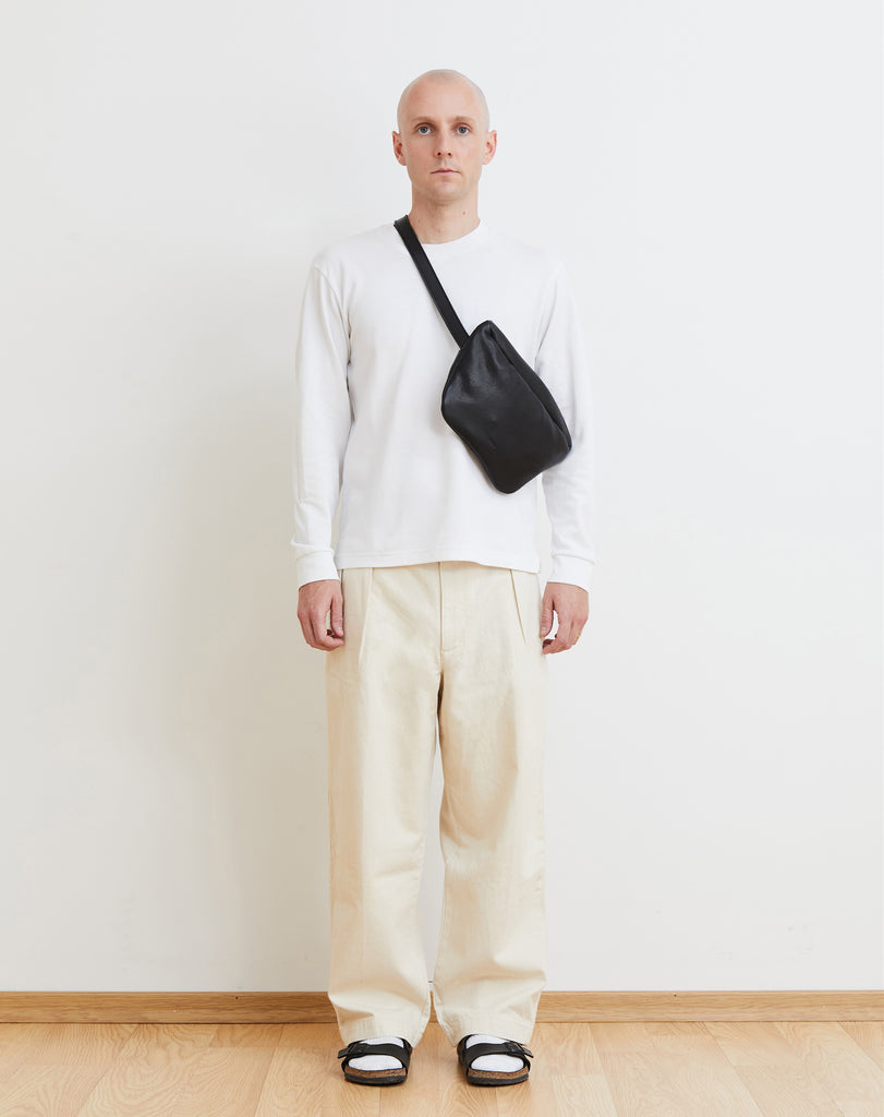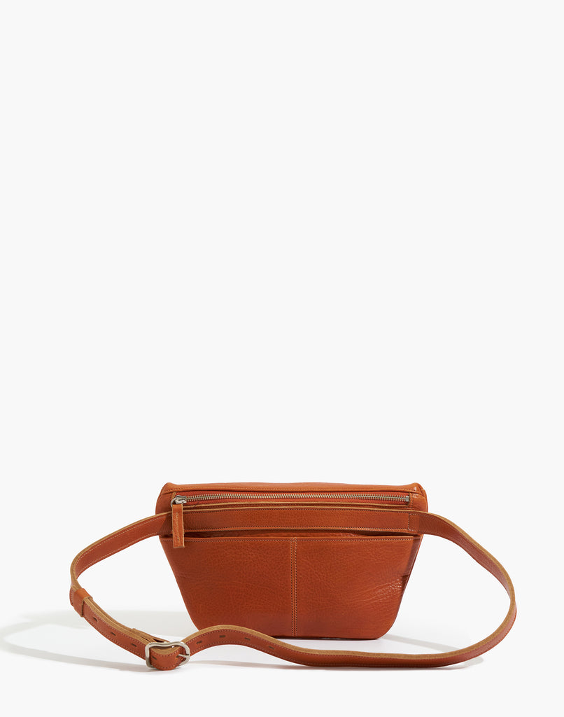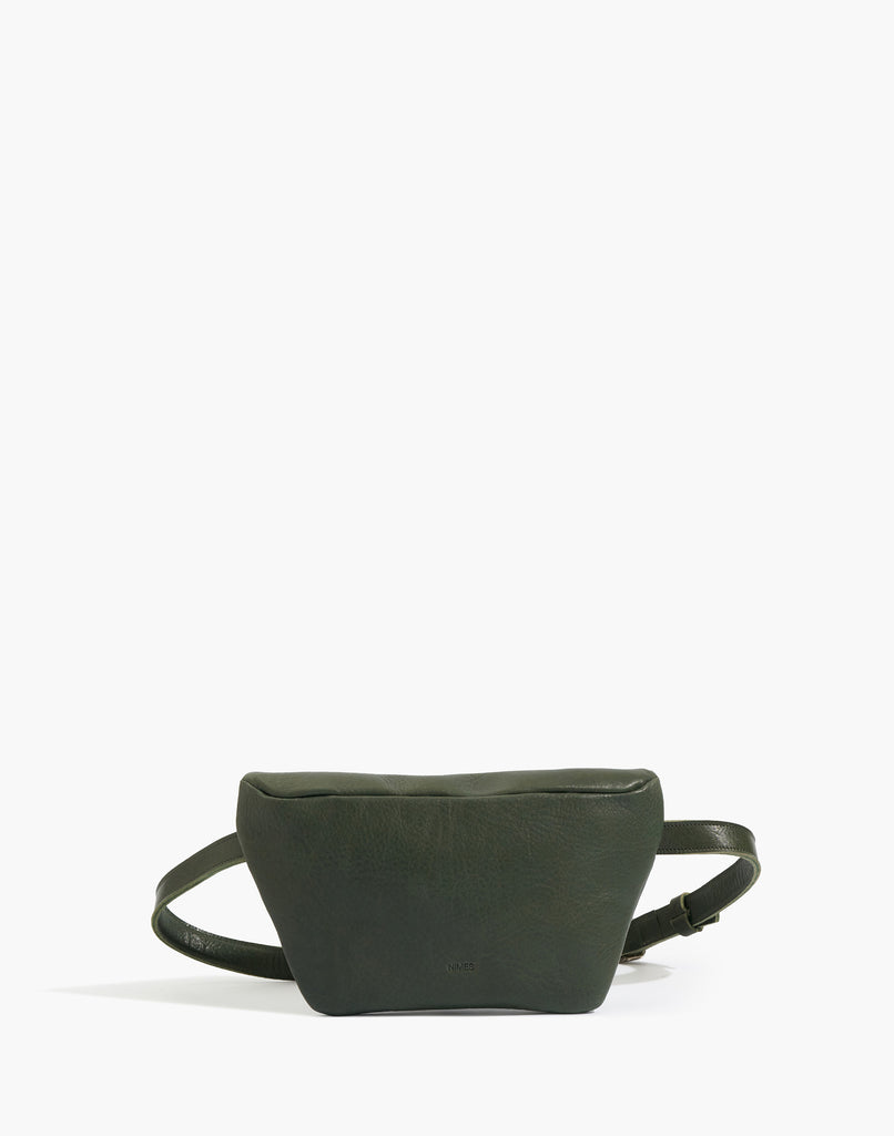 Crafted from grainy, vegetable-tanned natural leather, this fanny pack features a small debossed ‘NIMES’ logo, a rear zippered closure, an adjustable strap, a rear external pocket, a small internal pocket, and a printed cotton interior.