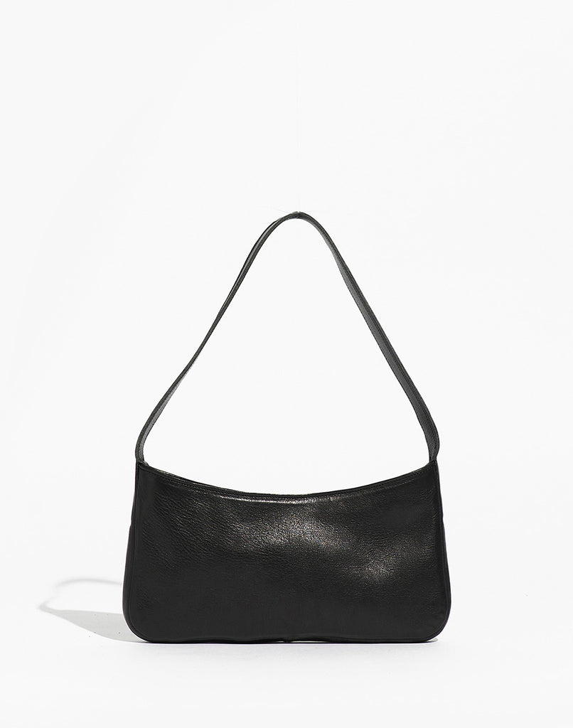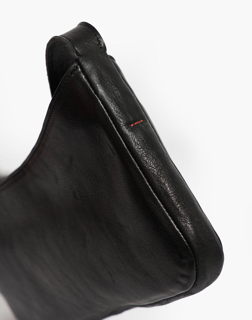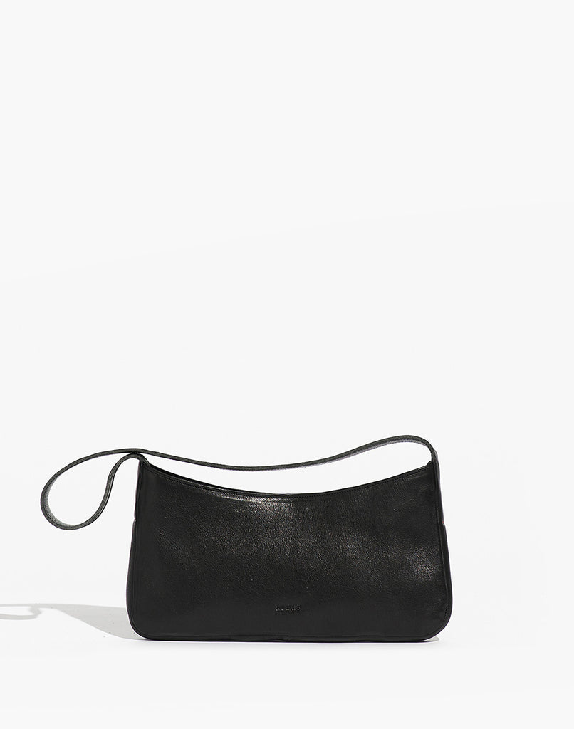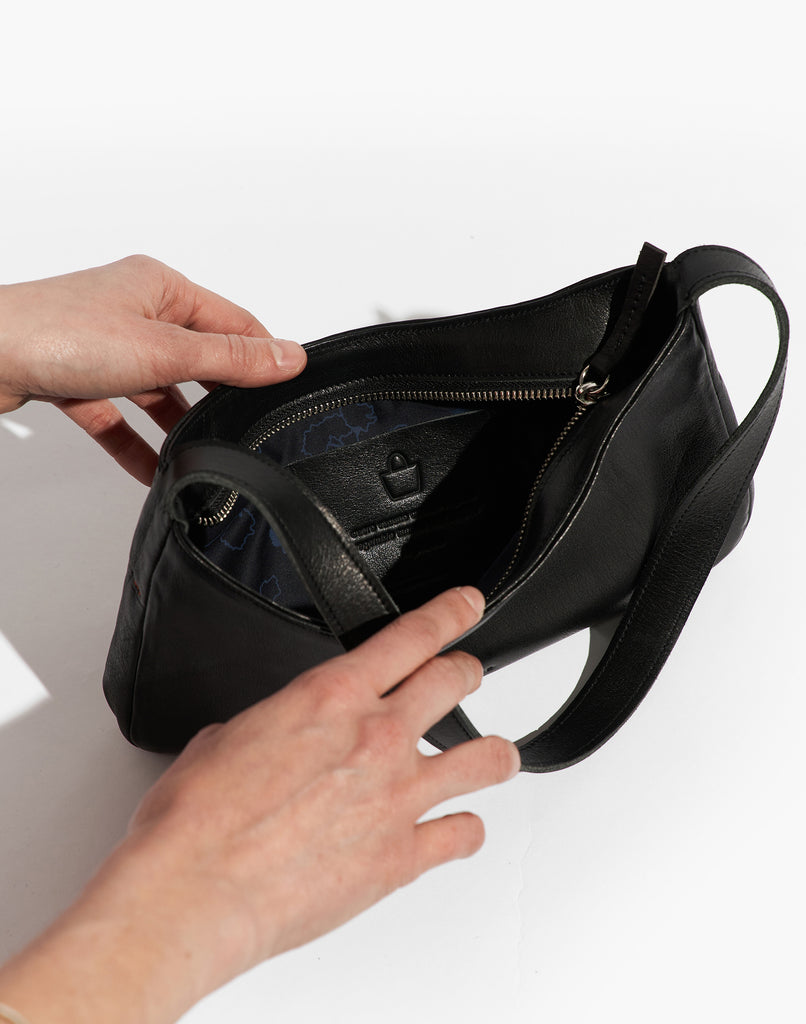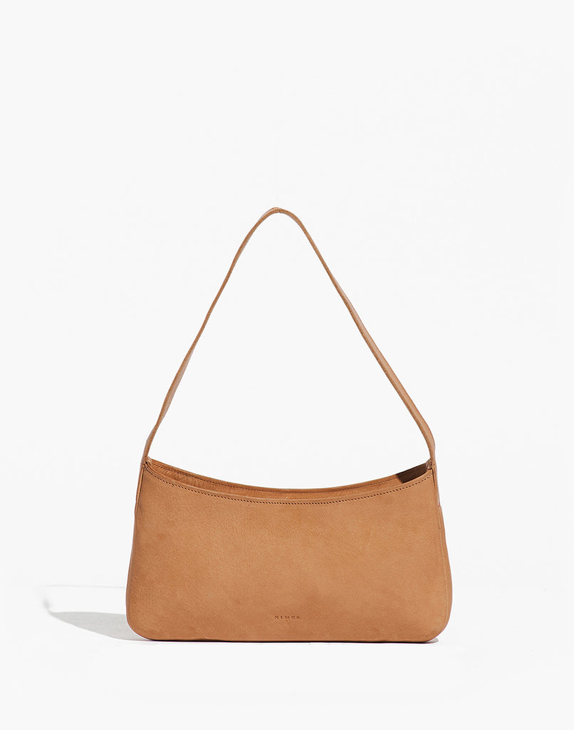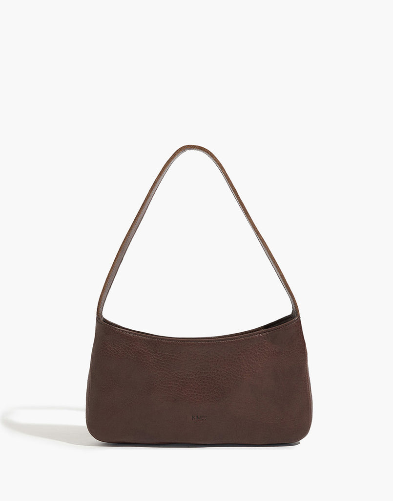 Crafted from grainy, vegetable-tanned natural leather, this shoulder bag features a small debossed ‘NIMES’ logo, a top zippered closure, an internal card slot, and a printed cotton interior.