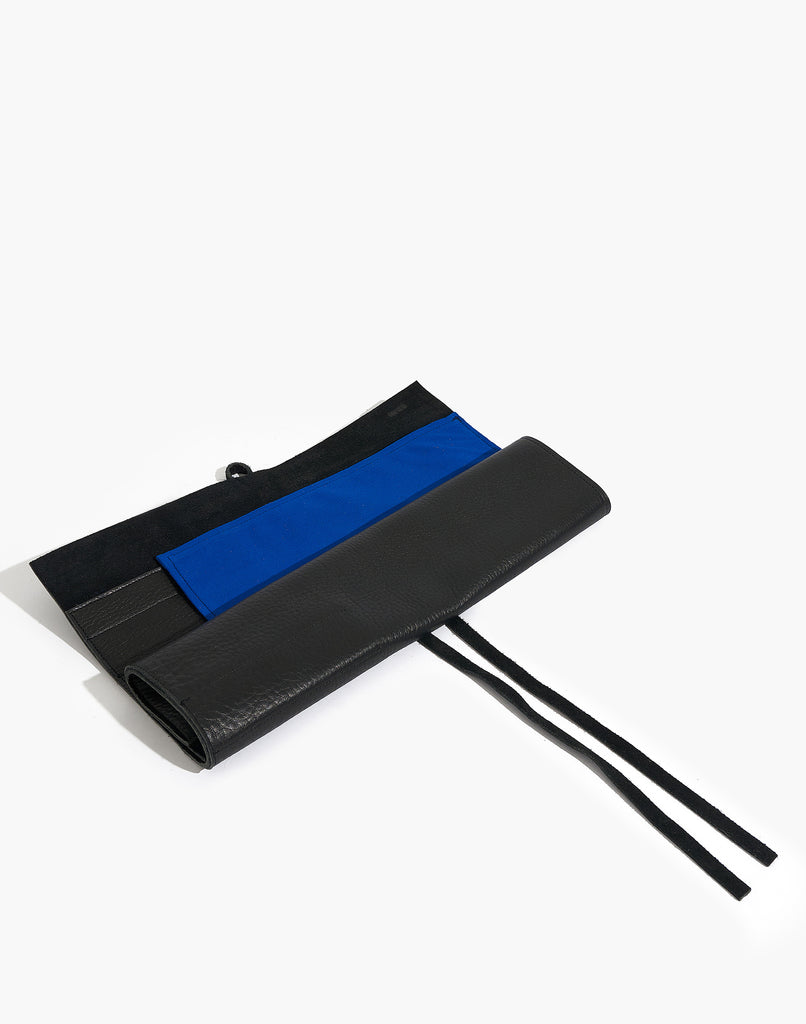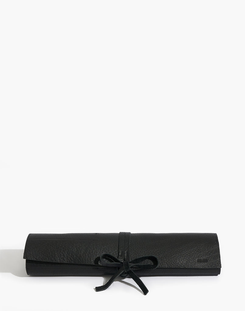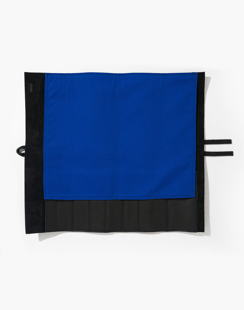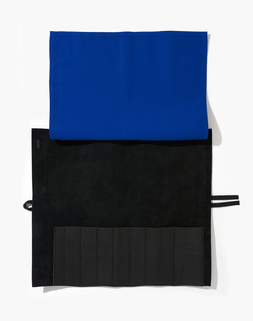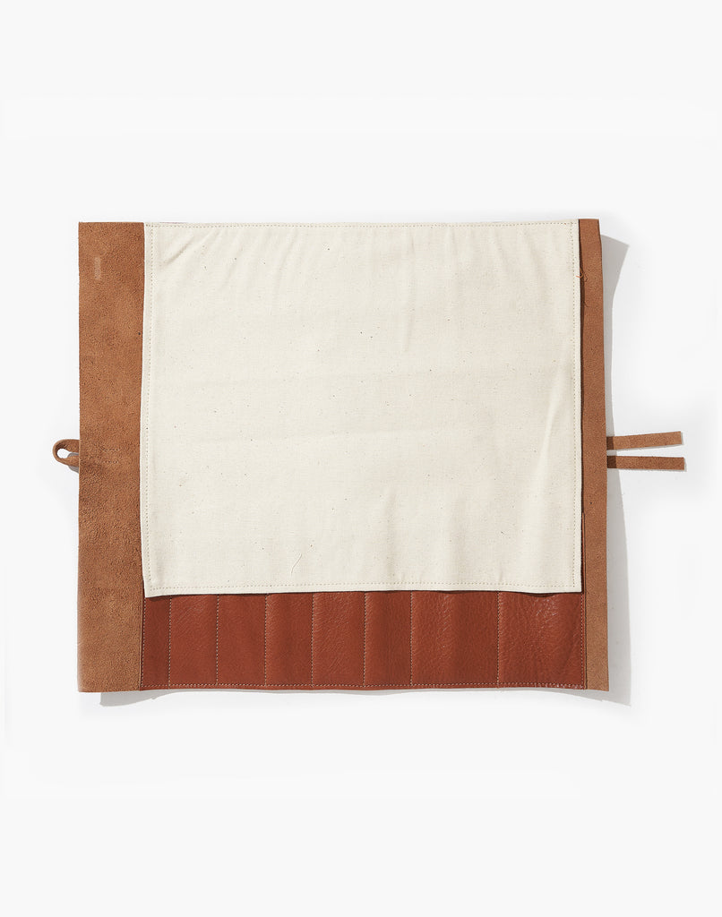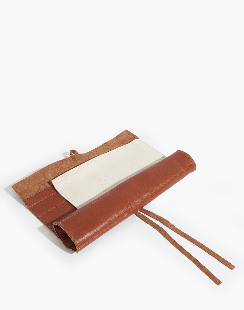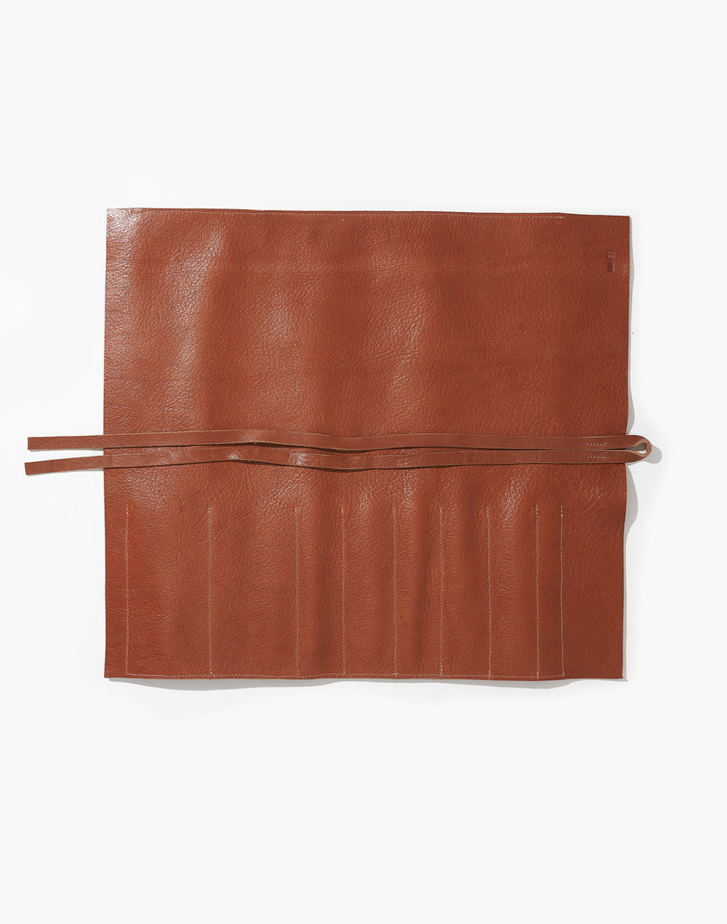 Crafted from grainy, vegetable-tanned natural leather, this knife case features a foldable design secured with a leather strap, eight slots of varying sizes, a small debossed ‘NIMES’ logo, and a cotton interior.