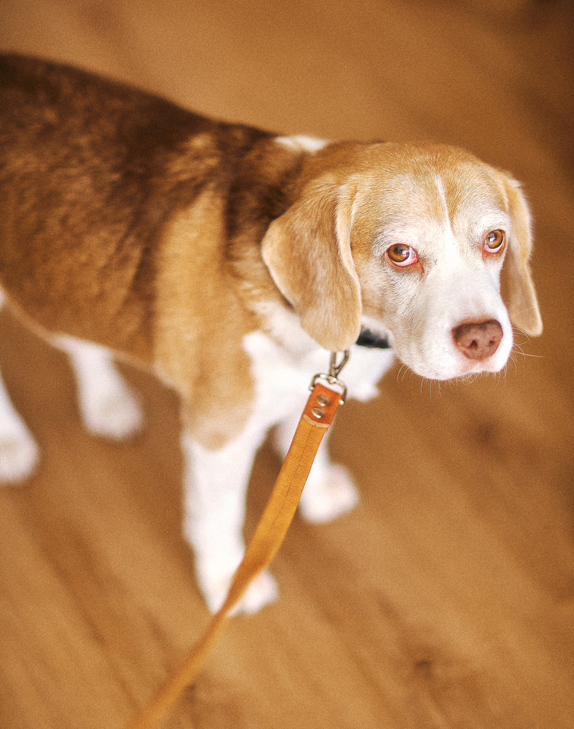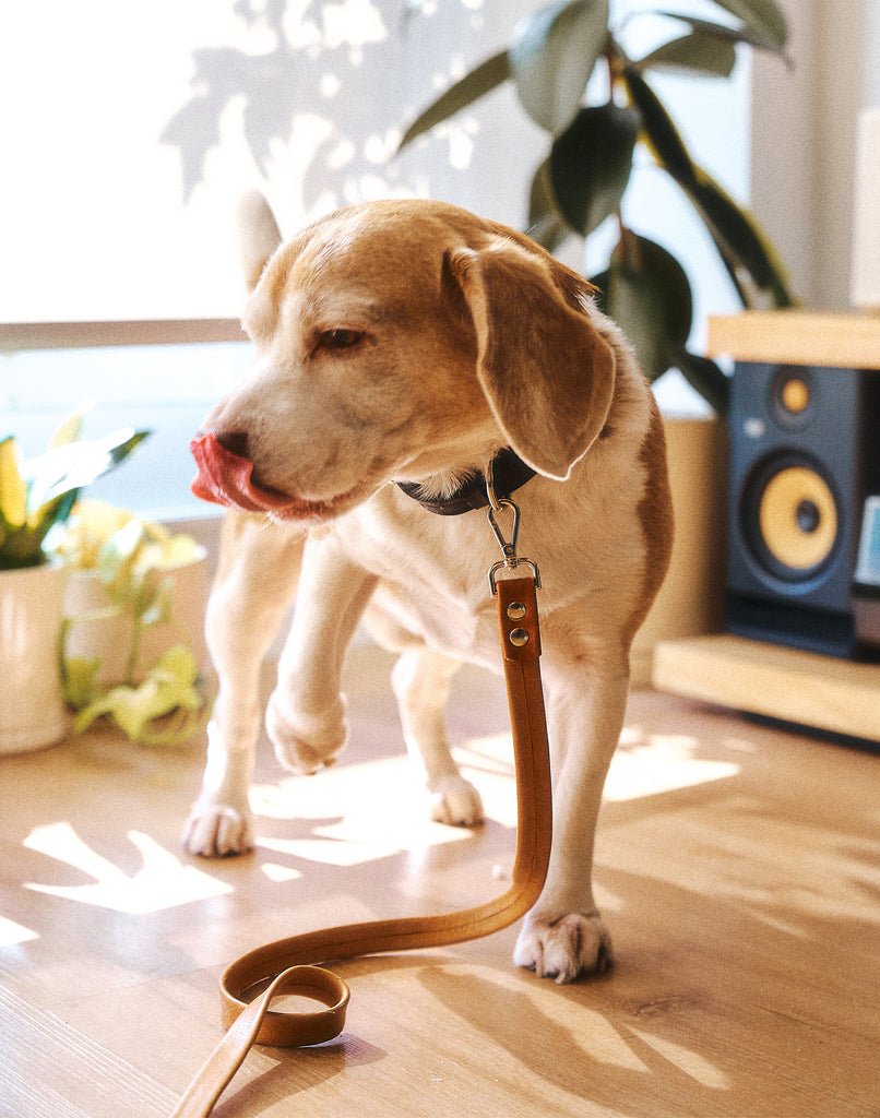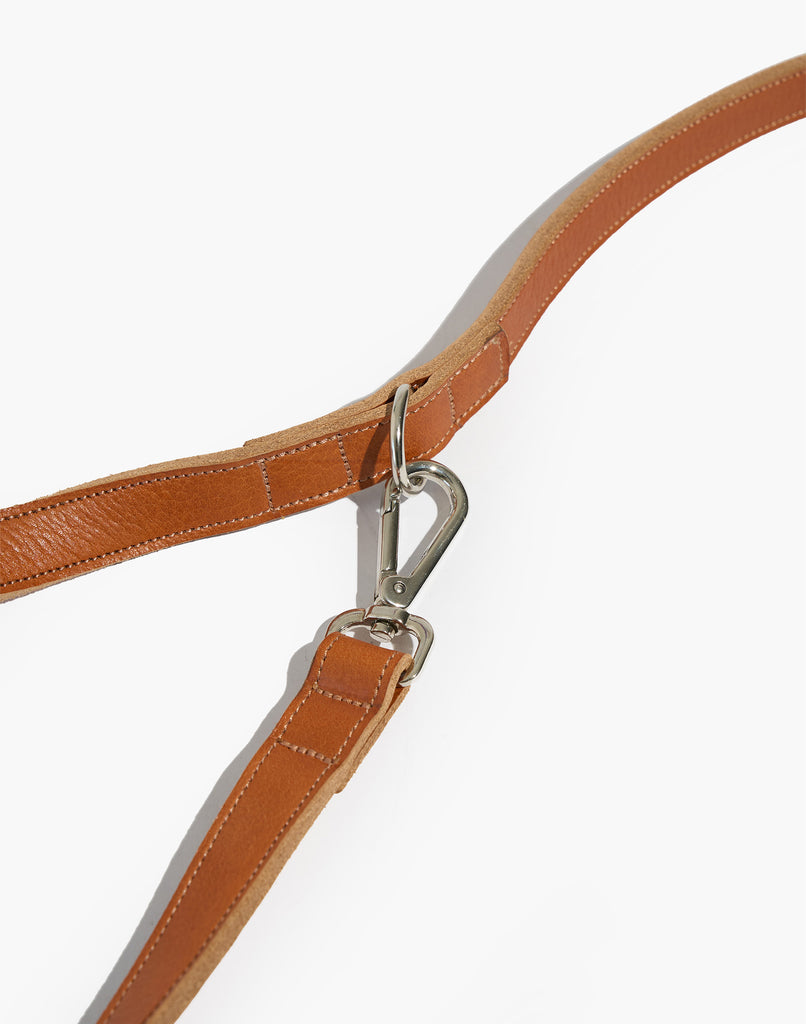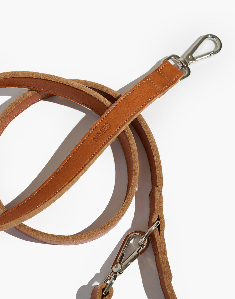 Crafted from grainy, vegetable-tanned natural leather, this dog leash features a debossed ‘NIMES’ logo, silver-tone hardware, and an ergonomic swivel clasp for secure attachment.